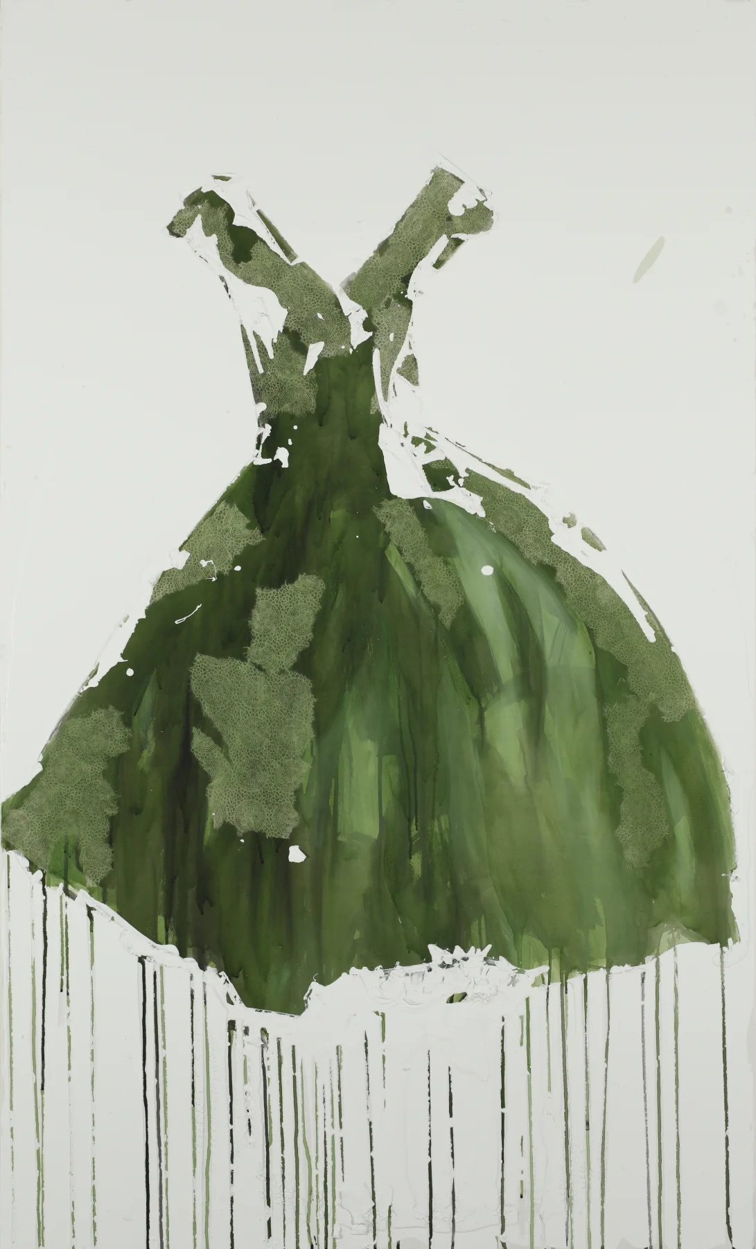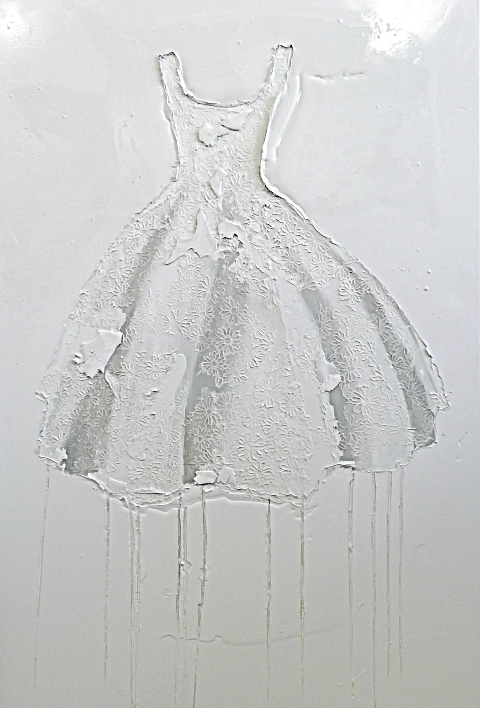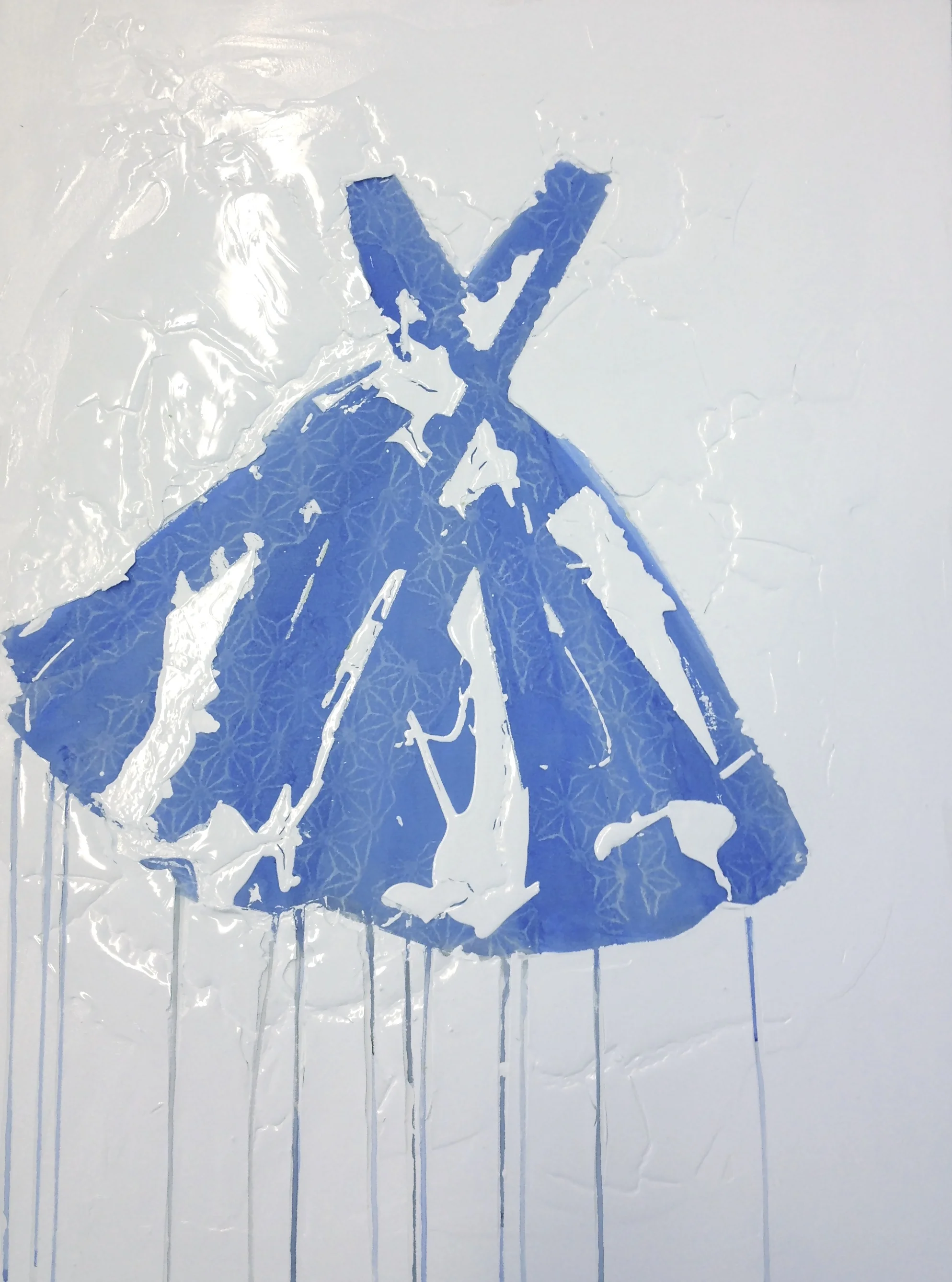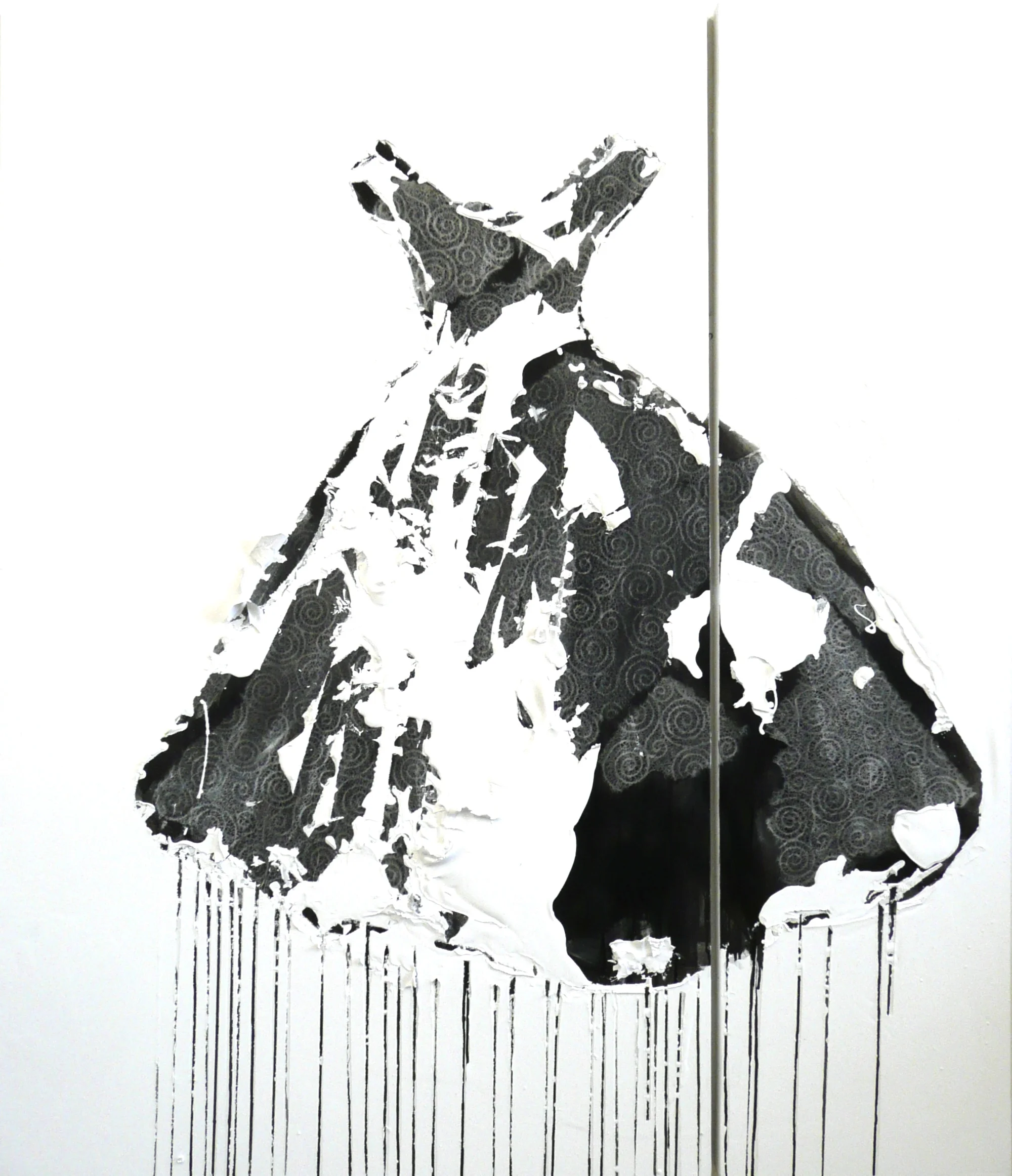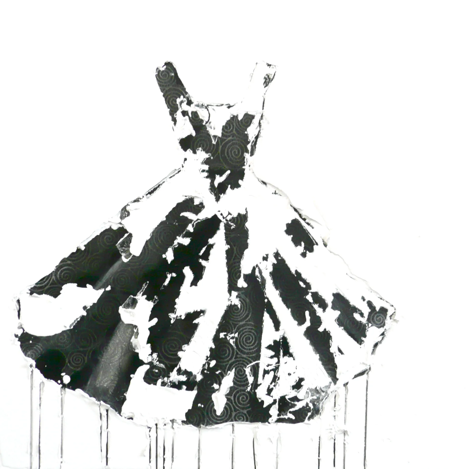 In my dress series, I delve deep into the heart of contrast, weaving a narrative that celebrates the harmonious discord between disparate mediums. Each piece is a symphony of textures and tones, where the delicate intricacies of handmade paper dance in tandem with the bold strokes of creamy paint. The juxtaposition of these elements—smooth against rough, delicate against robust—creates a visual dialogue that is both captivating and profound. As the boundaries between mediums blur, a sense of unity emerges, transcending the constraints of individuality to reveal the inherent beauty of contrast.